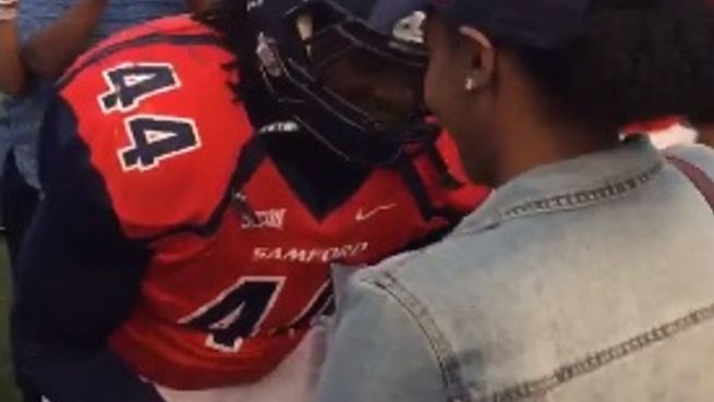 Beim American Football geht es oft hart zu, aber abseits des Platzes scheinen die muskelbepackten Spieler ziemlich weiche Herzen zu haben. Das bewies nun der amerikanische Linebacker Deion Pierre, der hielt nämlich auf dem Spielfeld um die Hand seiner Freundin an.